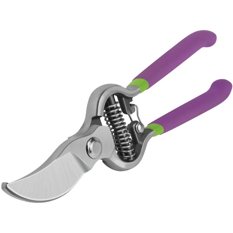 Секатор с коваными изогнутыми лезвиями Изготовлен из легированной стали Дополнительная закалка лезвий Прецезионная заточка Надёжный фиксатор-крючок Эргономичные обрезиненные рукоятки