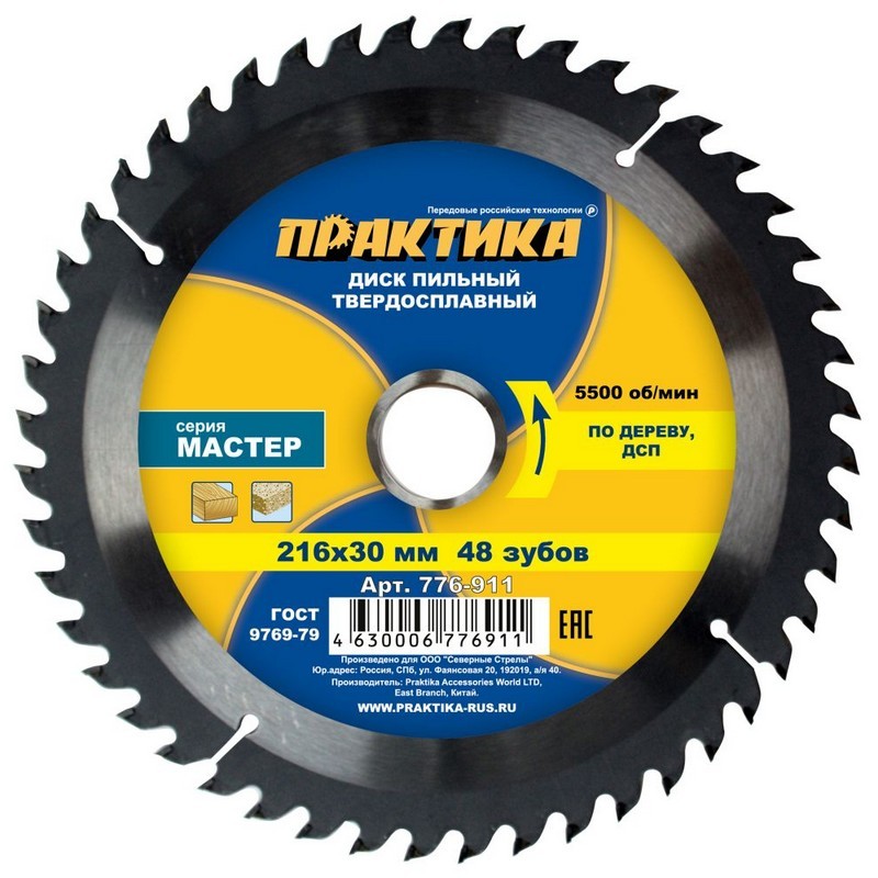 Диск пильный по дереву 216/30мм 48-зуб. твёрдосплав. ПРАКТИКА 776-911